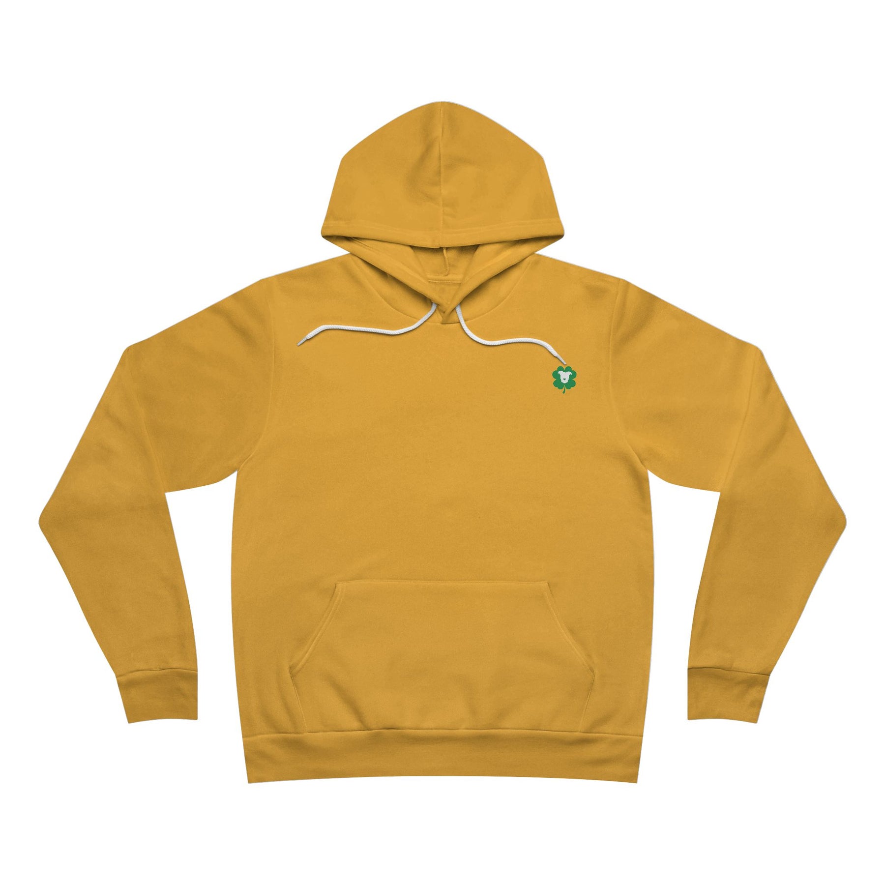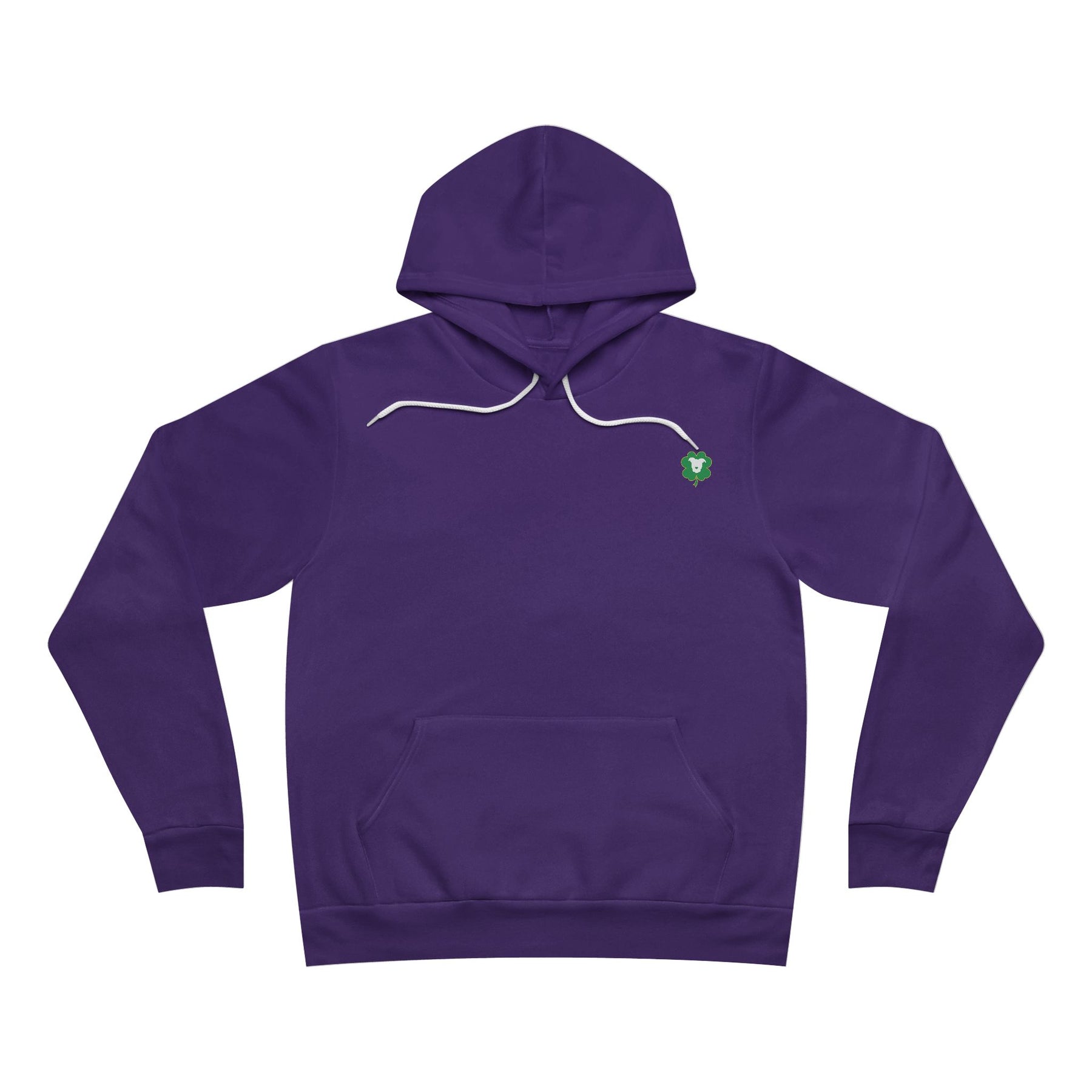 The unisex sponge fleece pullover hoodie is a blend of Airlume cotton and polyester. The percentages vary according to color. A pouch-style pocket spreads across the lower half of the garment’s front. The hood can be tightened with a white drawcord. Both cuffs and waistband have ribbing for extra grip.